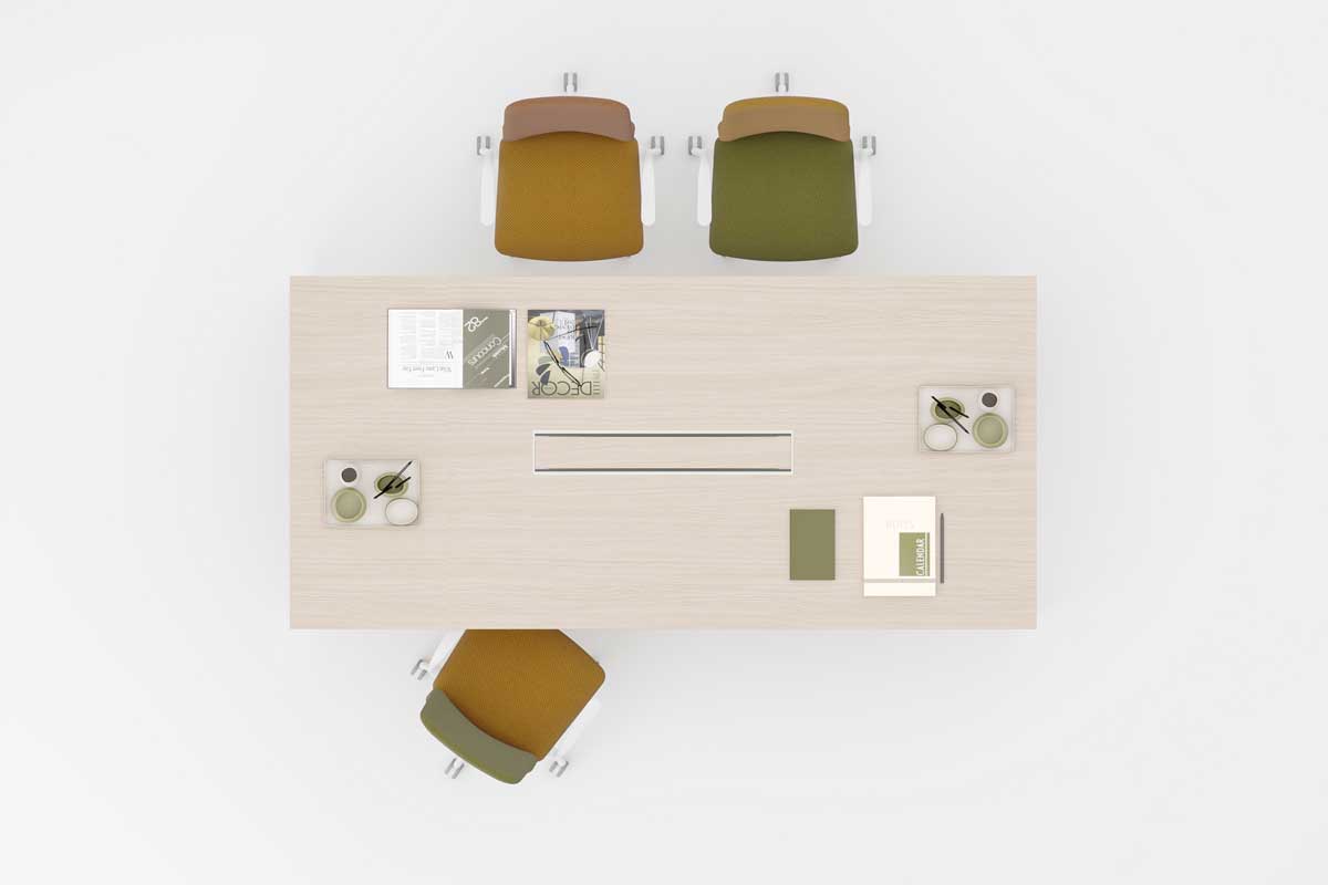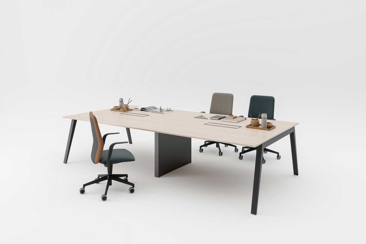 Disponible en diferentes profundidades y longitudes, se ofrece con una superficie fija o en versión modular con superficies modulares y pata central común. Puede equiparse con cableado Profcable de varios tamaños en acabado anodizado o pintado, con una puerta abatible del mismo acabado que la superficie.