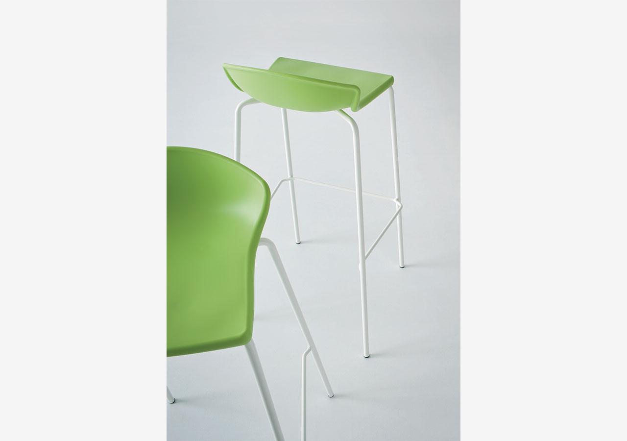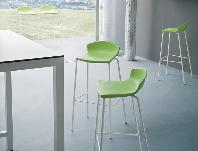 un taburete ergonómico y apilable, ligero y robusto, con un diseño sencillo y elegante. Disponible con estructura metálica de cuatro patas, en dos alturas diferentes, cromado o pintado para exterior. Su amplia gama de colores vibrantes lo hace ideal para cualquier entorno.