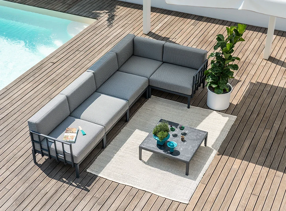Enjoy es un sistema modular con estructura de tecnopolímero y amplios cojines que combina estilo y confort para cualquier necesidad de decoración. Su diseño imita el tejido natural, creando una estética única y refinada que se integra armoniosamente en cualquier ambiente exterior. Los elementos modulares de asientos, respaldos, reposabrazos y tableros se conectan fácilmente entre sí, lo que permite una gran versatilidad y una personalización infinita, creando así el espacio perfecto para cada huésped. Un concepto de hospitalidad único que también apuesta por la sostenibilidad, gracias a su estructura 50 % reciclada, certificada como «Plastica Seconda Vita/Second Life Plastic», a la vez que garantiza una gran resistencia y durabilidad.