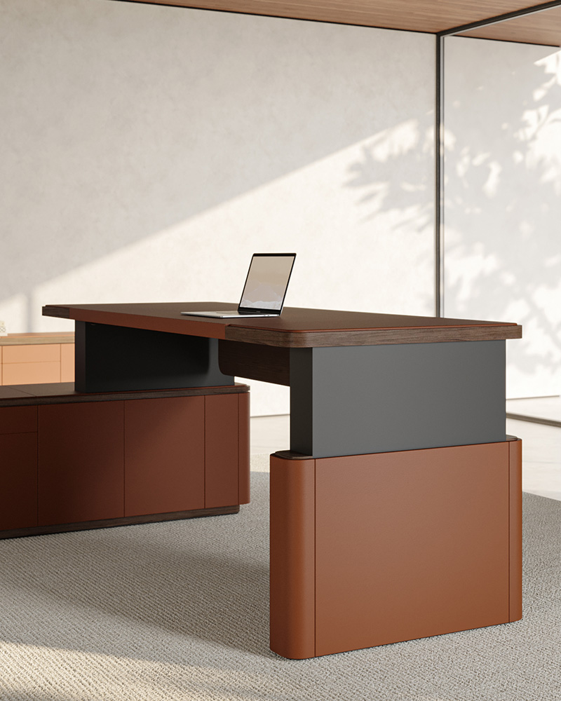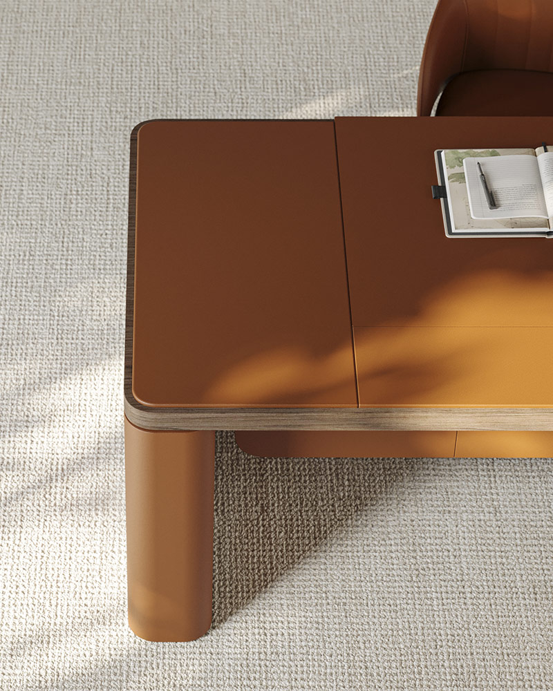 Apoyado por una pata de cuero de líneas suaves y un mueble de servicio acanalado con puertas y cajones forrados en cuero, el escritorio combina funcionalidad y estética de forma natural. El tablero de madera ligeramente redondeado, completamente forrado en cuero, y el elegante sistema de gestión de cables, también forrado en cuero, reflejan el cuidado de la sastrería y la atención al detalle.