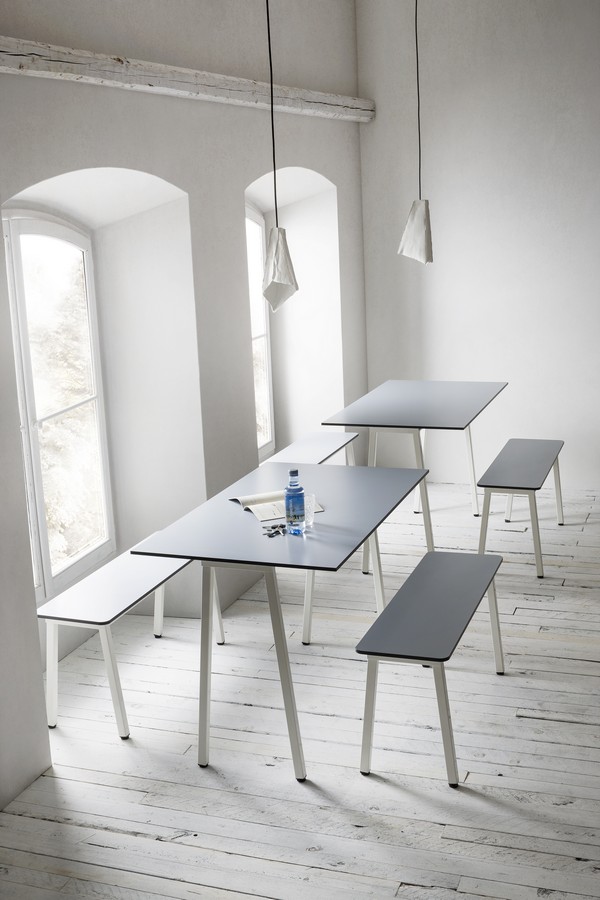 Mesa con estructura metálica pintada y tablero Compactop. Apta para exteriores. Patas ajustables.