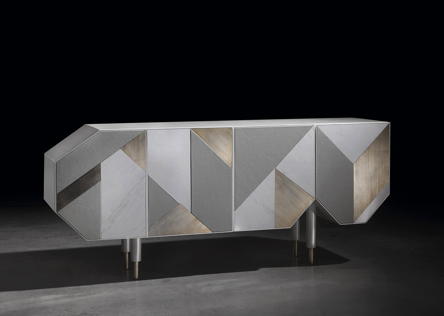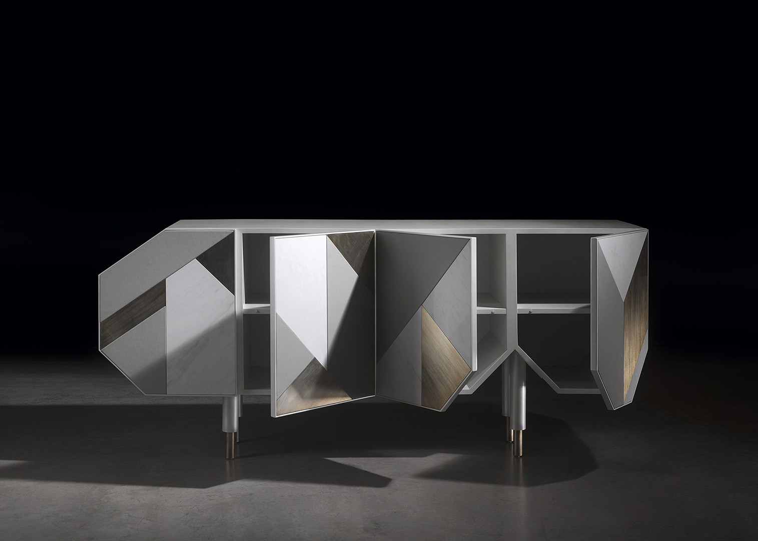 El aparador George ha sido diseñado por estudiHac para Alexandra, quien ha dejado volar su imaginación con geometrías imposibles en un diseño de fantasía que se integra perfectamente en diferentes estilos decorativos. Un mueble de corte contemporáneo que rompe con su esencia tradicional a partir de la creación de una trama geométrica irregular que compone el frontal del mueble. Una trama que permite combinar diferentes materiales, desde la piel, cerámica, lacados de alta calidad y madera, aportándole ese carácter único y personal. El original aparador George está disponible en dos opciones de acabado.