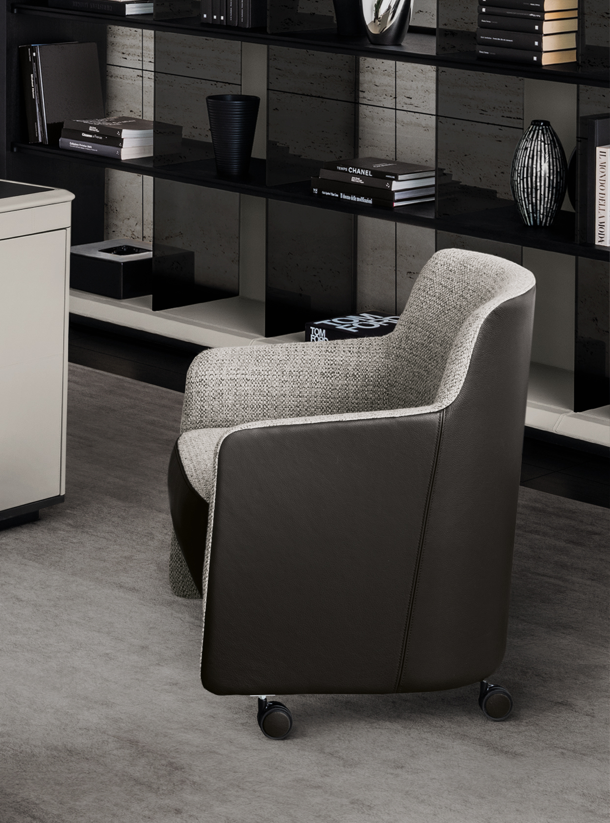 Gill define una nueva interpretación de la comodidad al ofrecer una experiencia de relajación durante una duración sin límites de tiempo. Se integra en cualquier contexto, desde la mesa del comedor hasta las salas de reuniones. El sillón de bañera acolchado tiene un marco de acero incrustado en una espuma de poliuretano formada por frío hecha en moho y está tapizado en tela o cuero; En la versión sobre ruedas es fácil moverla entre las diferentes habitaciones.