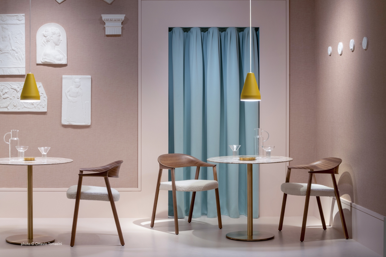 Héra es un sillón de fresno o nogal americano que concreta el concepto de ligereza y lo combina con el de comodidad y una forma envolvente. El respaldo en multicapa curvada tridimensional, de solo 6 mm de grosor, es agradable de agarrar, además de caracterizarse por su elegancia y ergonomía, mientras que el asiento tapizado de espuma de poliuretano soportado por cinchas elásticas maximiza el confort. Las patas de sección rectangular con esquinas redondeadas contribuyen a expresar la atención al detalle que hace que Héra sea especialmente adecuado para su colocación en algunos de los restaurantes y hoteles más representativos del panorama internacional. El asiento puede estar tapizado en tela, piel o piel ecológica.