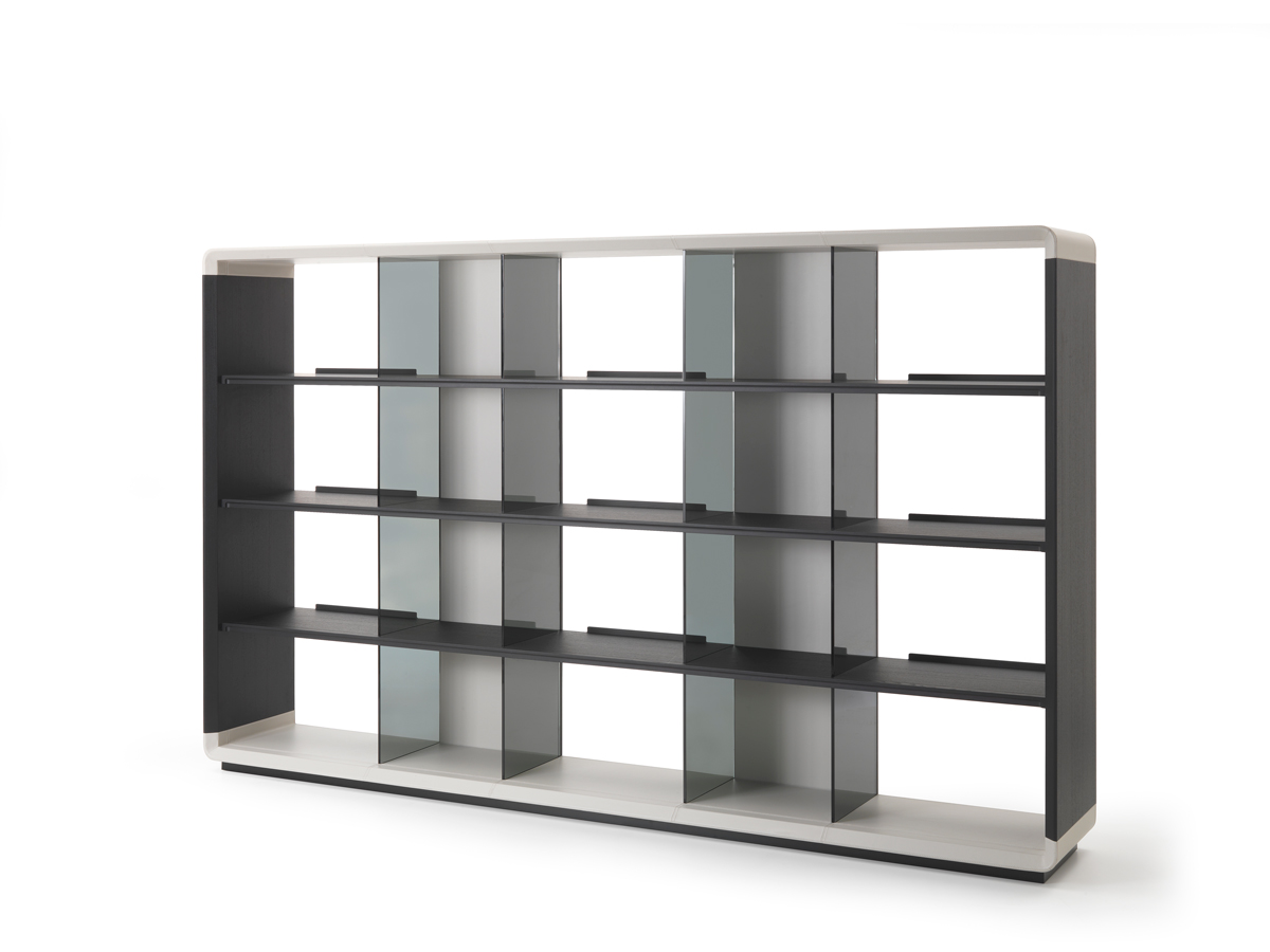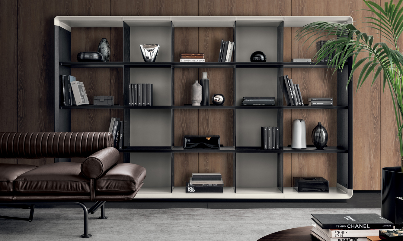 Disponible en dos tamaños, Herman tiene un lado abierto, que se cierra solo en el centro con los respaldos de cuero suave o de silla de montar, mientras que los bordes posteriores, que se colocan en los estantes para evitar que los libros caigan, se conviertan en elementos decorativos.