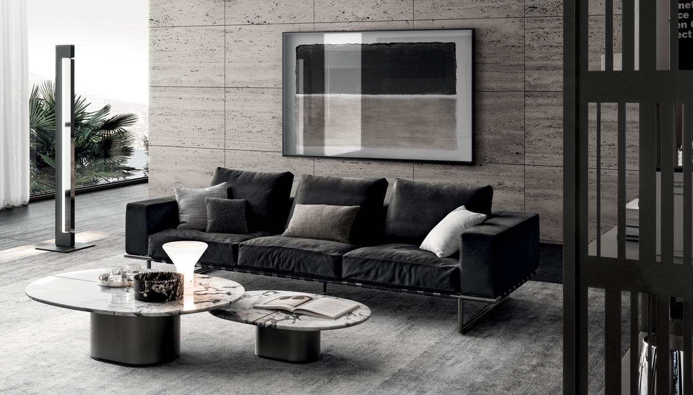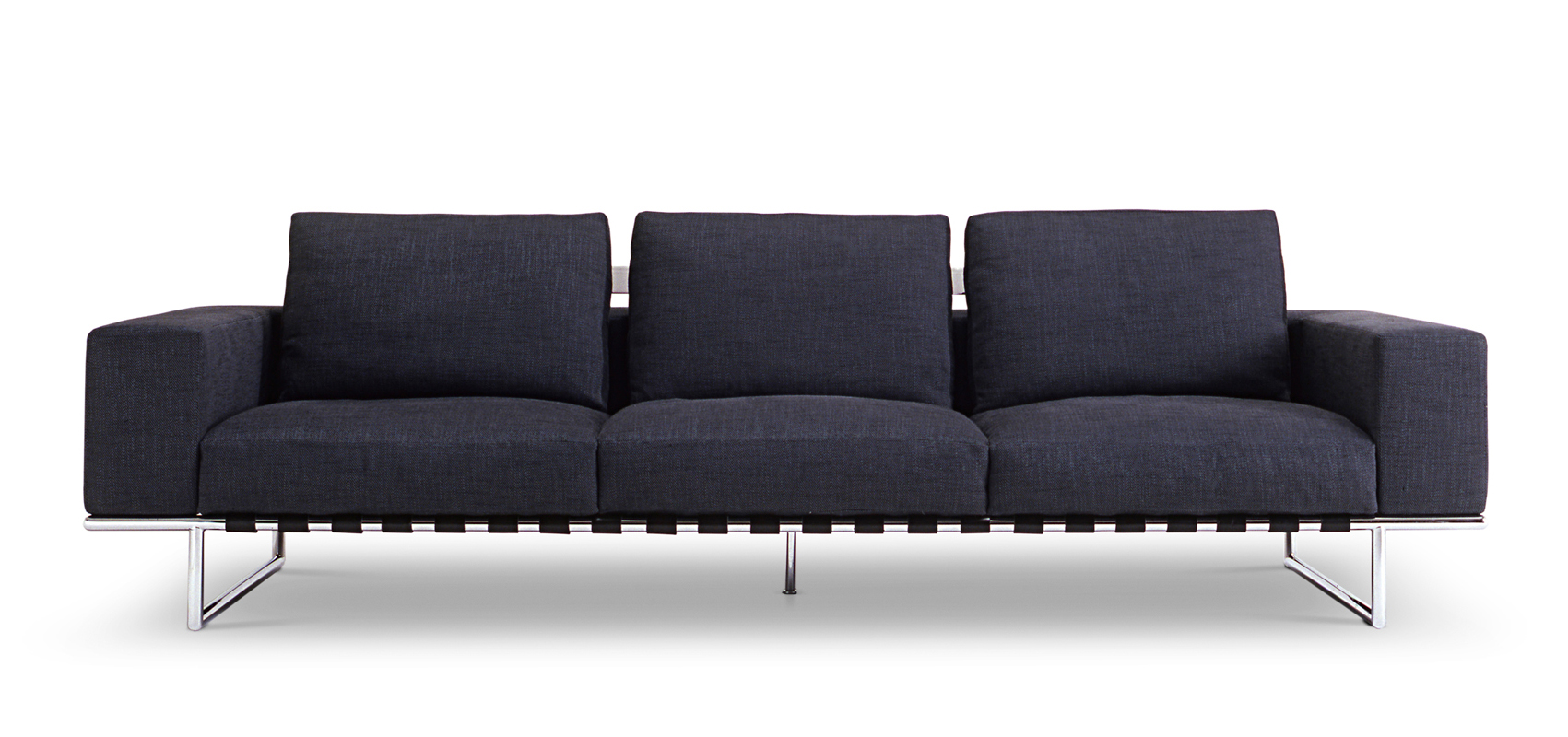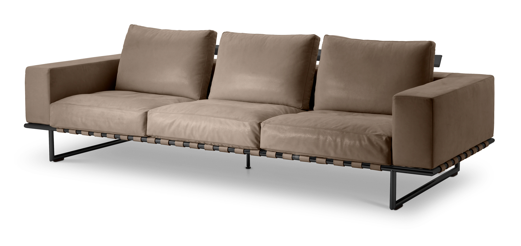 Una sensación de rigor, riqueza sin igual y atención al detalle. Las correas de cuero envueltas alrededor del marco de acero de la base transmiten una impresión resistente, ya que brindan apoyo a los cojines fuertes pero generosos; Al mismo tiempo, el área de los asientos parece haber levitado, levantado suavemente del piso debajo, como si la línea luminosa del marco pudiera contrarrestar los efectos de la gravedad mundana. En la parte trasera del sofá, una placa de acero horizontal cromada o pintada contribuye al estilo visual elegante y permite que el sutil colocación de los cojines posteriores cree una disposición de asiento maravillosamente cómoda.