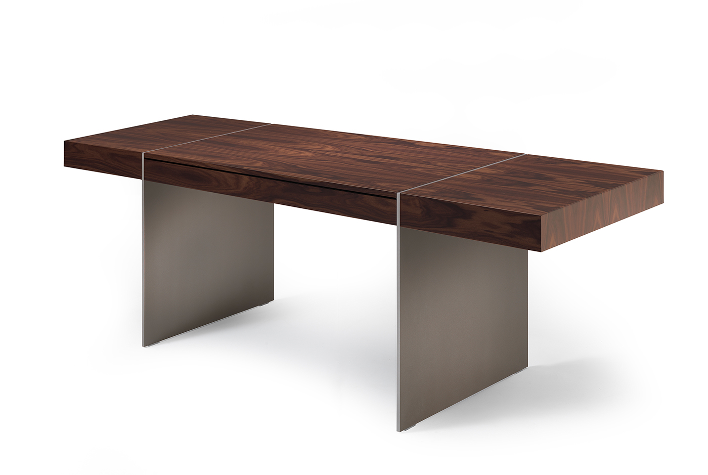 Escritorio de suite o home office con estructura escultórica creada uniendo las dos palas metálicas con la tapa. La estética aérea esencial se vuelve aún más sofisticada con la combinación de las lamas de metal en Dark Bronze o Light Gold Sunlight con la tapa en Dark Brown Santos Rosewood, un enchapado que aporta gran carácter al diseño. La tapa también está disponible bajo pedido lacada en color Ral o completamente tapizada en piel o piel de montar. En la versión de madera o lacada, también presenta la posibilidad de personalizarse con un inserto de cuero a medida para la zona de trabajo, mientras que un cajón de almacenamiento situado bajo la parte central es de serie. El diseño atemporal de Milano encarna a la perfección el concepto absoluto de modernidad donde la elegancia de las proporciones dialoga con la funcionalidad.