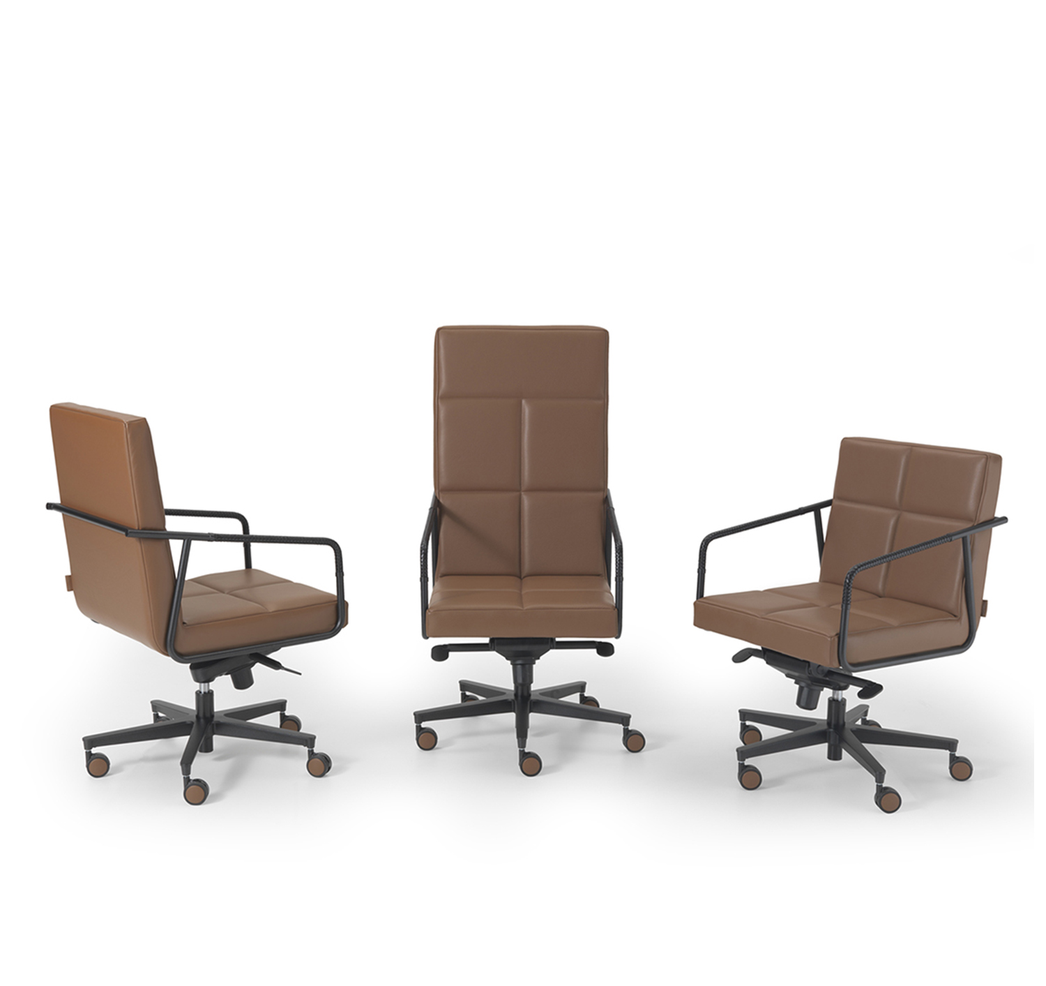 La colección PABLO se compone de tres sillas de oficina: una de dirección y dos de alturas diferentes, con base fija o con ruedas. El refinamiento de los detalles se mantiene inalterado, como el reposabrazos de acero tubular revestido de cuero trenzado, combinado con una imagen menos invasiva e ideal para combinar con una mesa de reuniones o un escritorio de dirección.