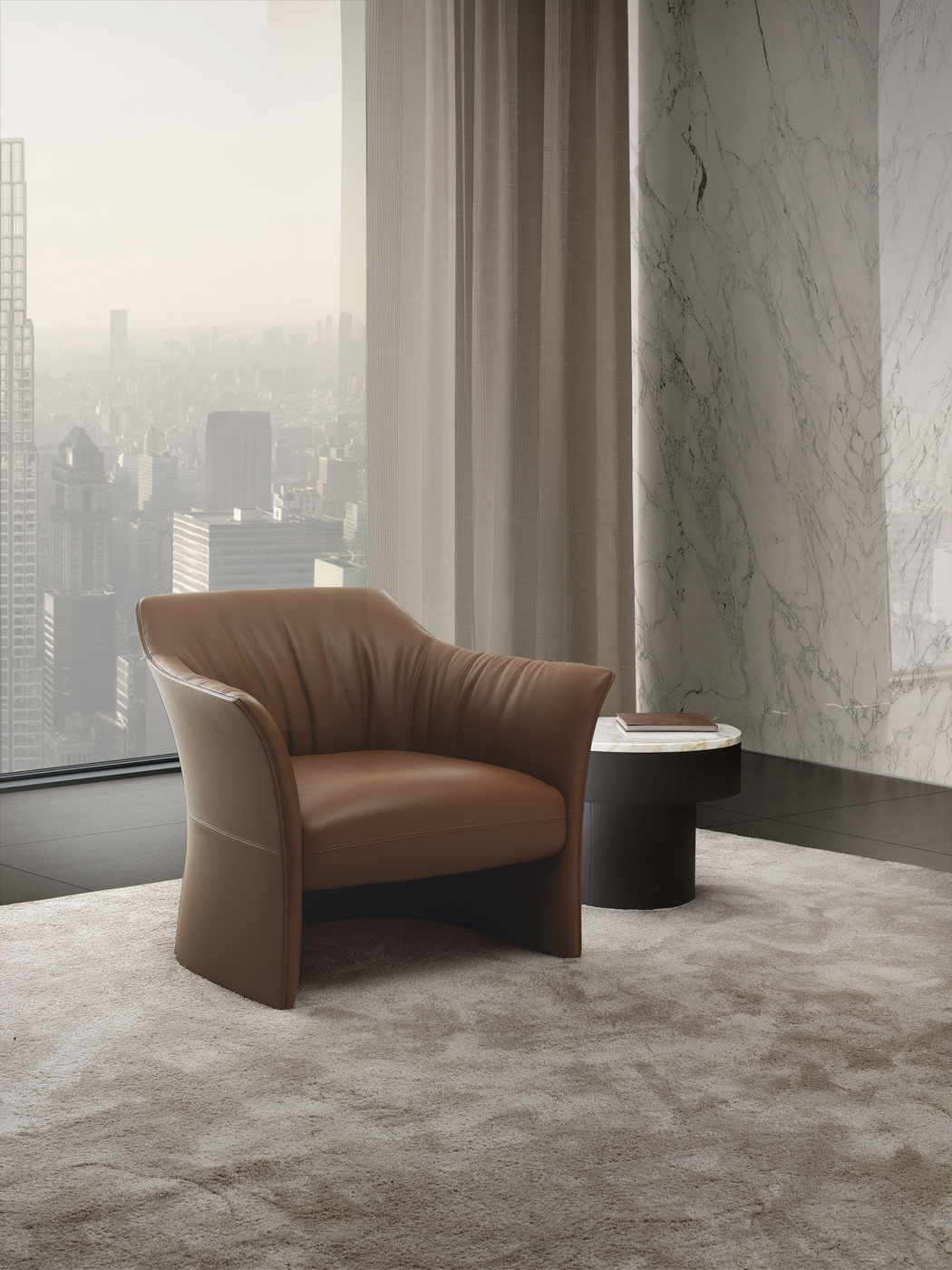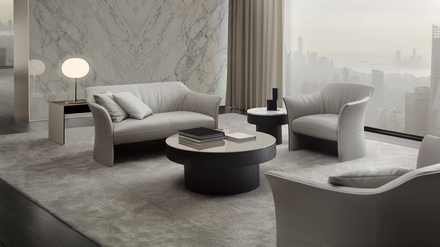 SELLA, cuyo nombre refleja la forma y la materialidad de las sillas de montar de los caballos, es una pequeña colección tapizada compuesta por sillas de trabajo, sofá lounge y sillón con una silueta esencial y al mismo tiempo sinuosa, capaz de realzar, gracias a los espesores calibrados, al revestimiento externo de cuero y al suave acolchado interno, la excelencia de la empresa en la artesanía a escala industrial. Un producto que sorprende por su ligereza efímera, líneas femeninas y signo firme.