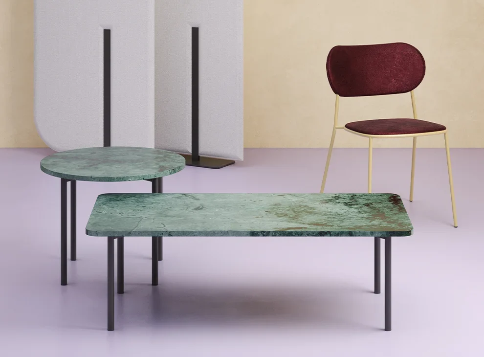 ag es una colección de mesas ideal para zonas de espera, con un estilo elegante y refinado. Tag utiliza una estructura de aluminio de 4 patas, disponible en vibrantes colores. Las encimeras de mármol, caracterizadas por vetas de piedra natural siempre diferentes, realzan la elegancia y el refinamiento en los entornos más exigentes.
