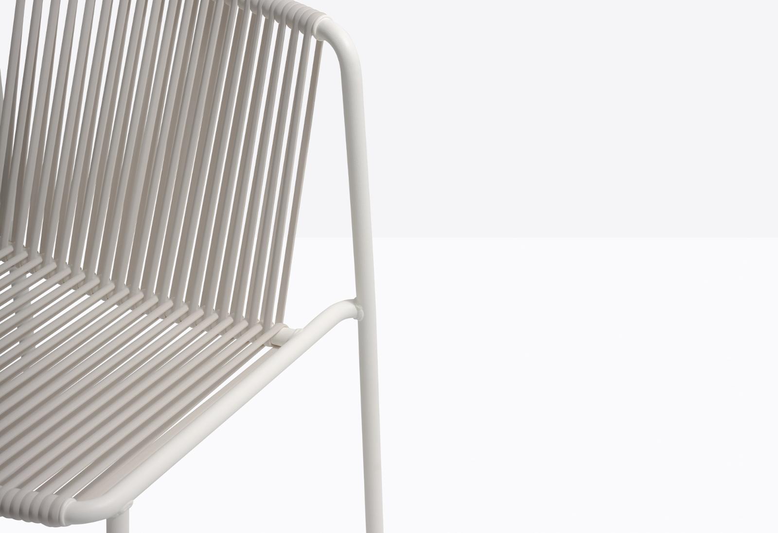 Tribeca nace de los ecos reconfortantes de la memoria, una reinterpretación en clave moderna de las clásicas sillas de terraza de los años sesenta, fabricadas de acero con trenzado. Silla con respaldo y asiento trenzados verticalmente con PVC extruido y núcleo de nailon, estructura en tubo de Ø 20mm.